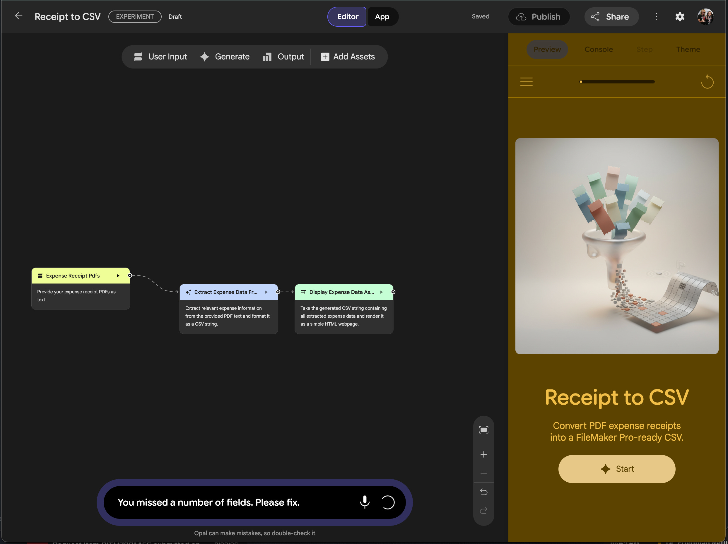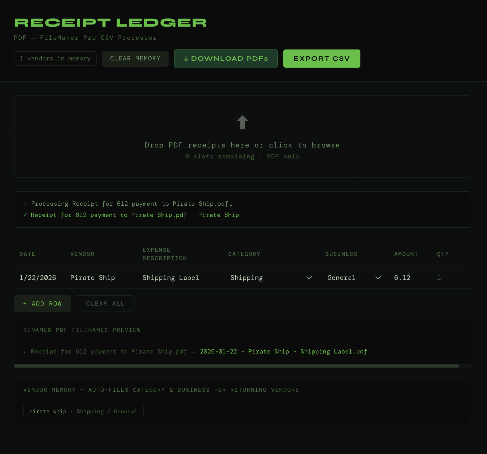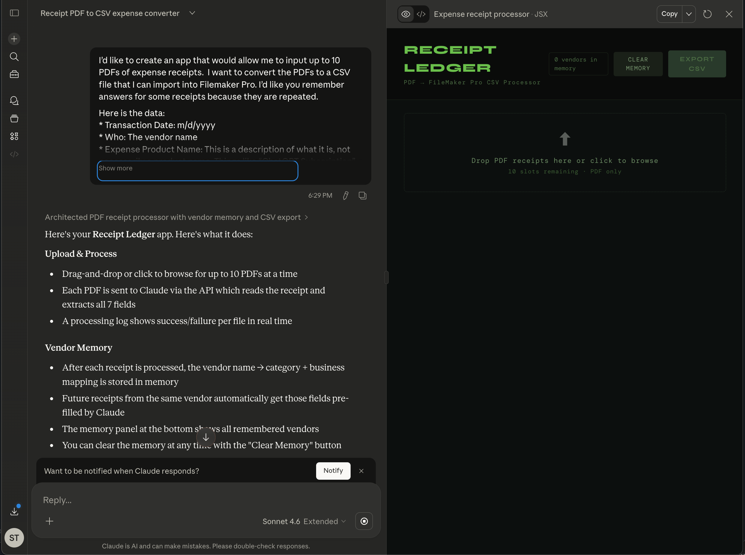 I’d like to create an app that would allow me to input up to 10 PDFs of expense receipts. I want to convert the PDFs to a CSV file that I can import into Filemaker Pro. I’d like you remember answers for some receipts because they are repeated.