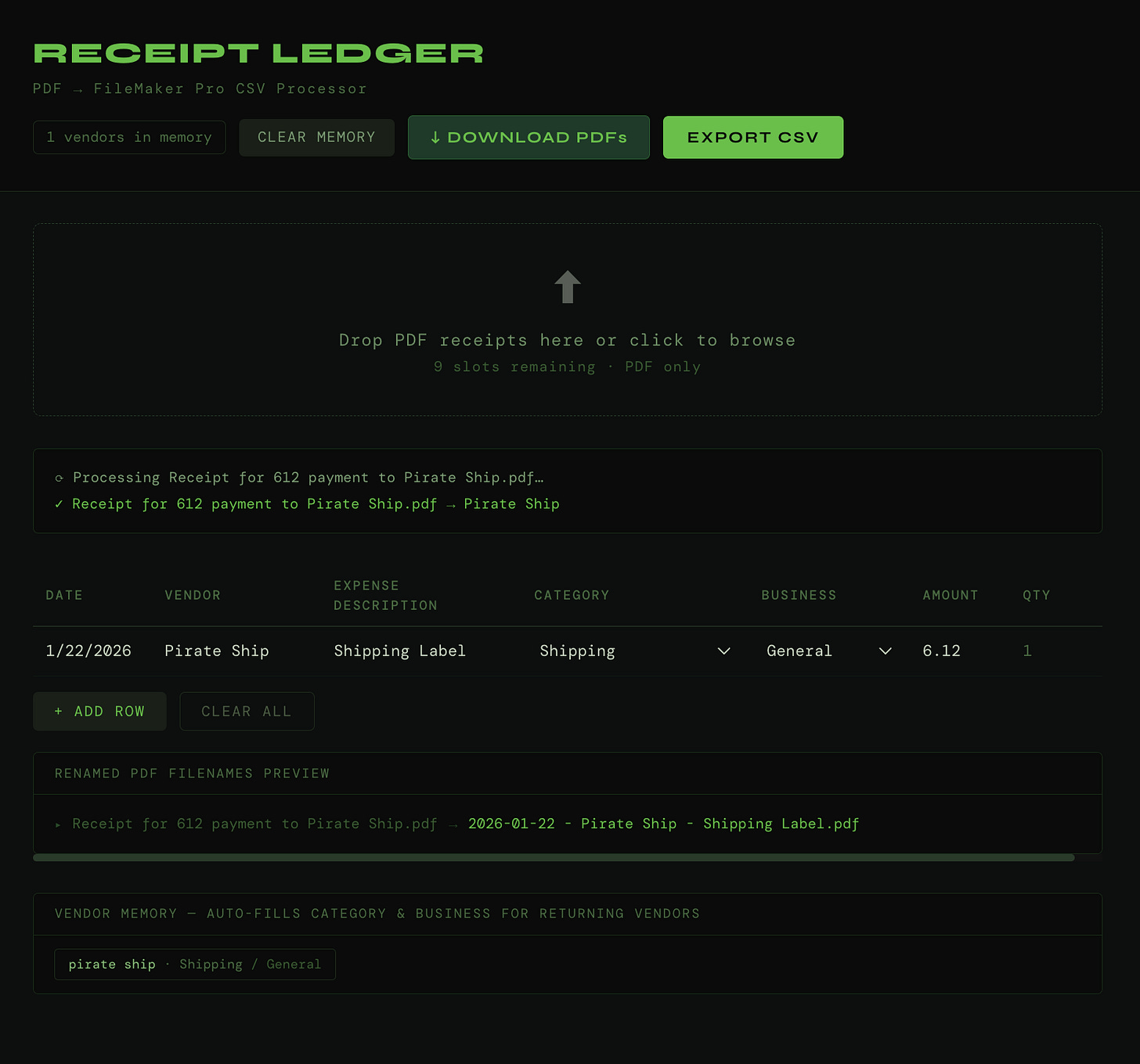 Now I had fun. Starting making changes like “vendor management” to change things like “Pirate Ship should always be “Shipping” . I was going to have it prompt since for Pirate Ship it could be candles or guitar pedals, but I’m going to add that metadata into the Pirate Ship receipt so AI can get that. You know something is working well when you are having fun.