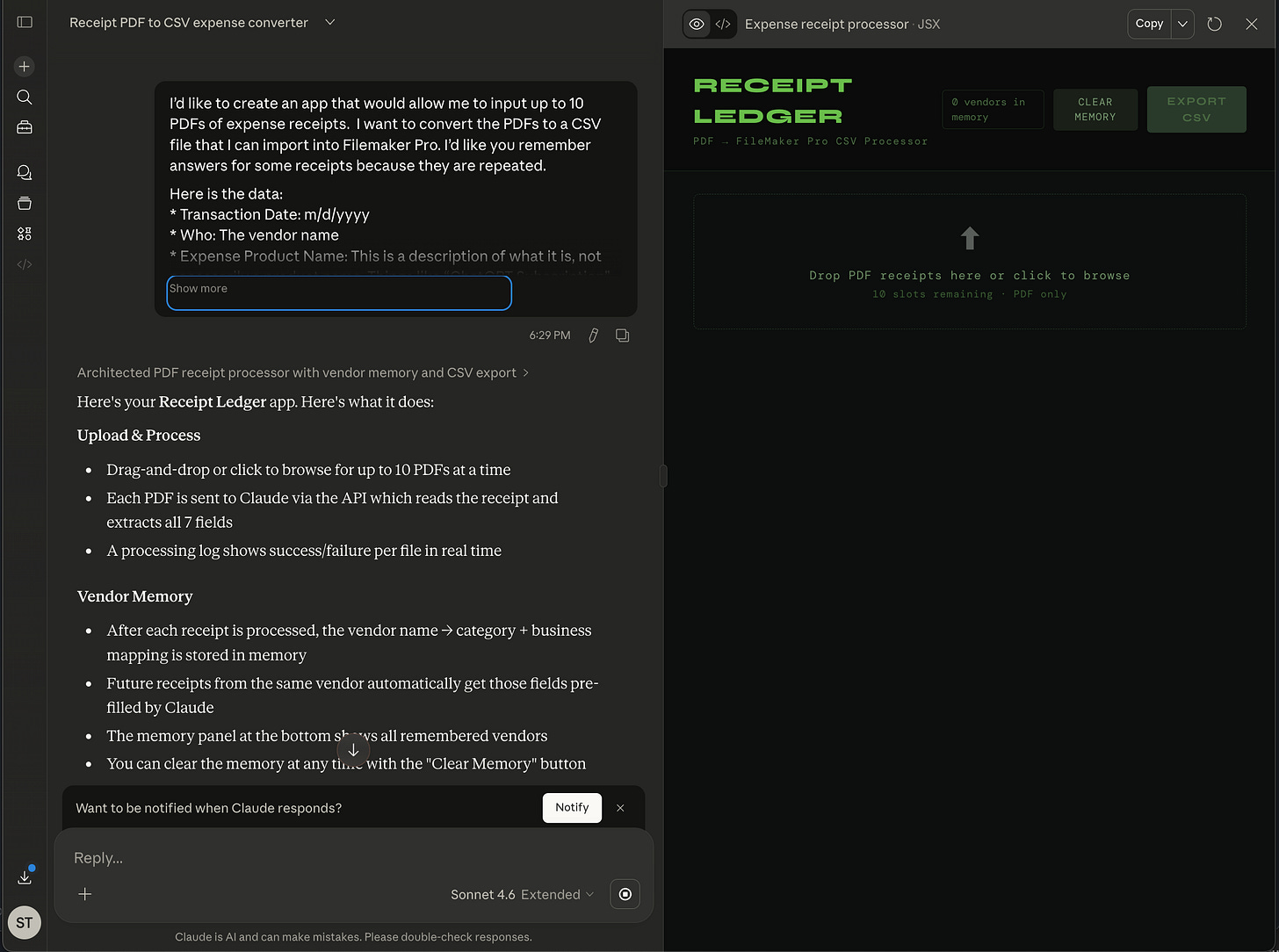 Lisa has a lot of receipts from her candle business. I wrote a FileMaker Pro (of course I did if you knew me at Disney) database to manage the products, sales and expenses. Receipts are a pain in the butt. If you remember, I wrote an receipt processor a few weeks ago for work. I was able to use Claude Cowork because I was developing it for work and I have a work license. I’m not bougie like that at home so I’m right now just using the free version of Claude to try to create an app for me. I also wanted to test using Google Gemini “Gem” to create a process. Here are my story…